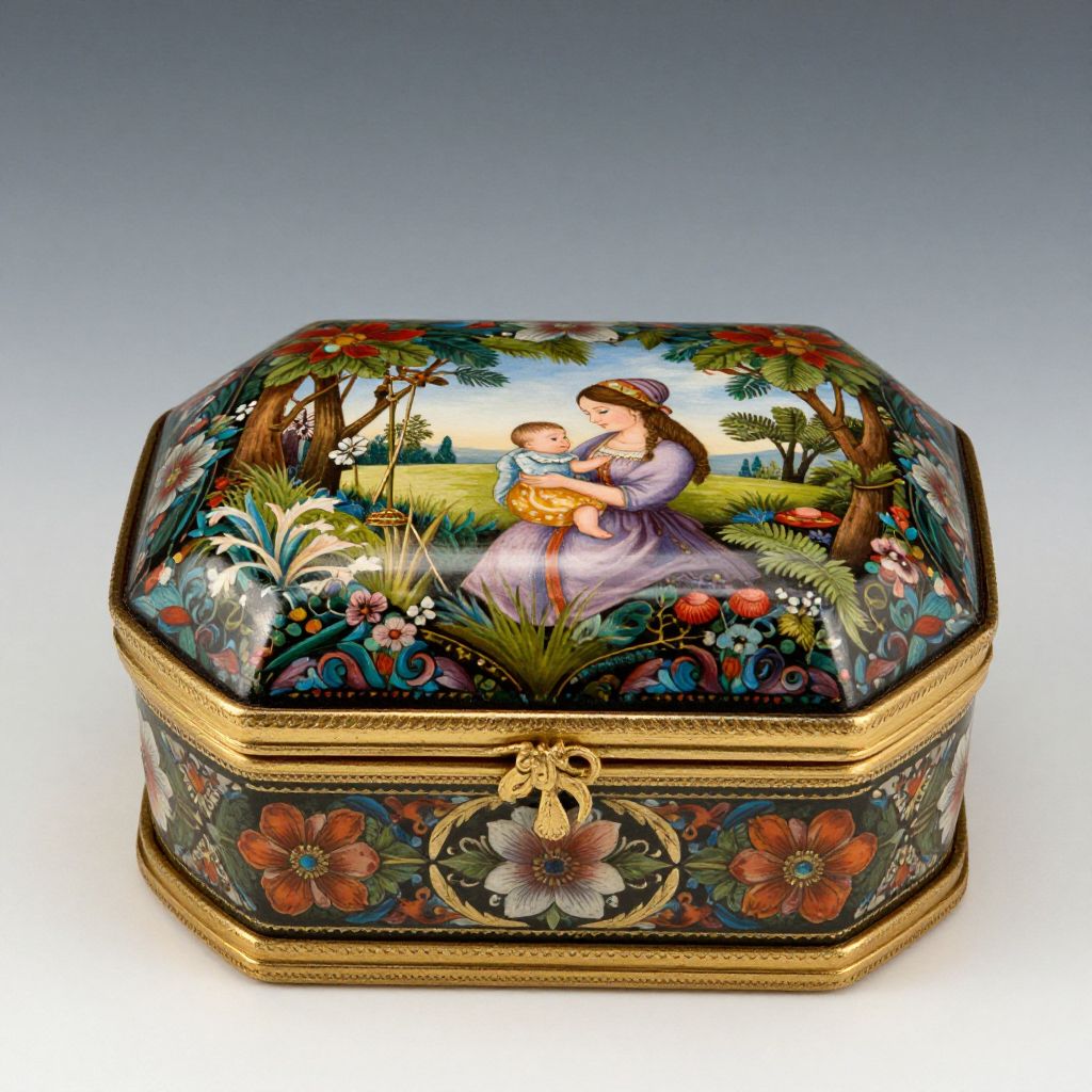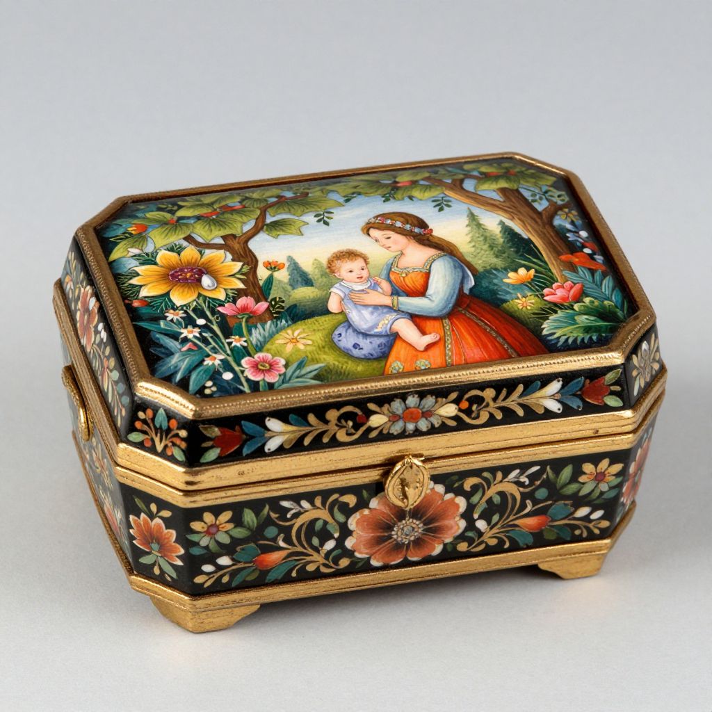 A beautifully crafted handmade Russian lacquer miniature box, showcasing the vibrant Kholuy Art Painting School style, features a hand-painted fairy tale scene of a woman holding a baby amidst lush greenery, adorned with intricate floral patterns and gold detailing, exemplifying traditional papier-mâché craftsmanship and artistic quality.