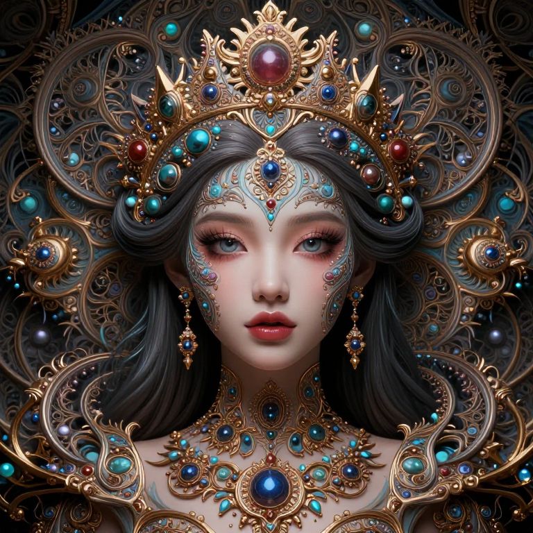 Digital artwork of an ethereal woman with pale skin, black hair, and striking blue eyes, adorned in an ornate gold and turquoise crown and necklace