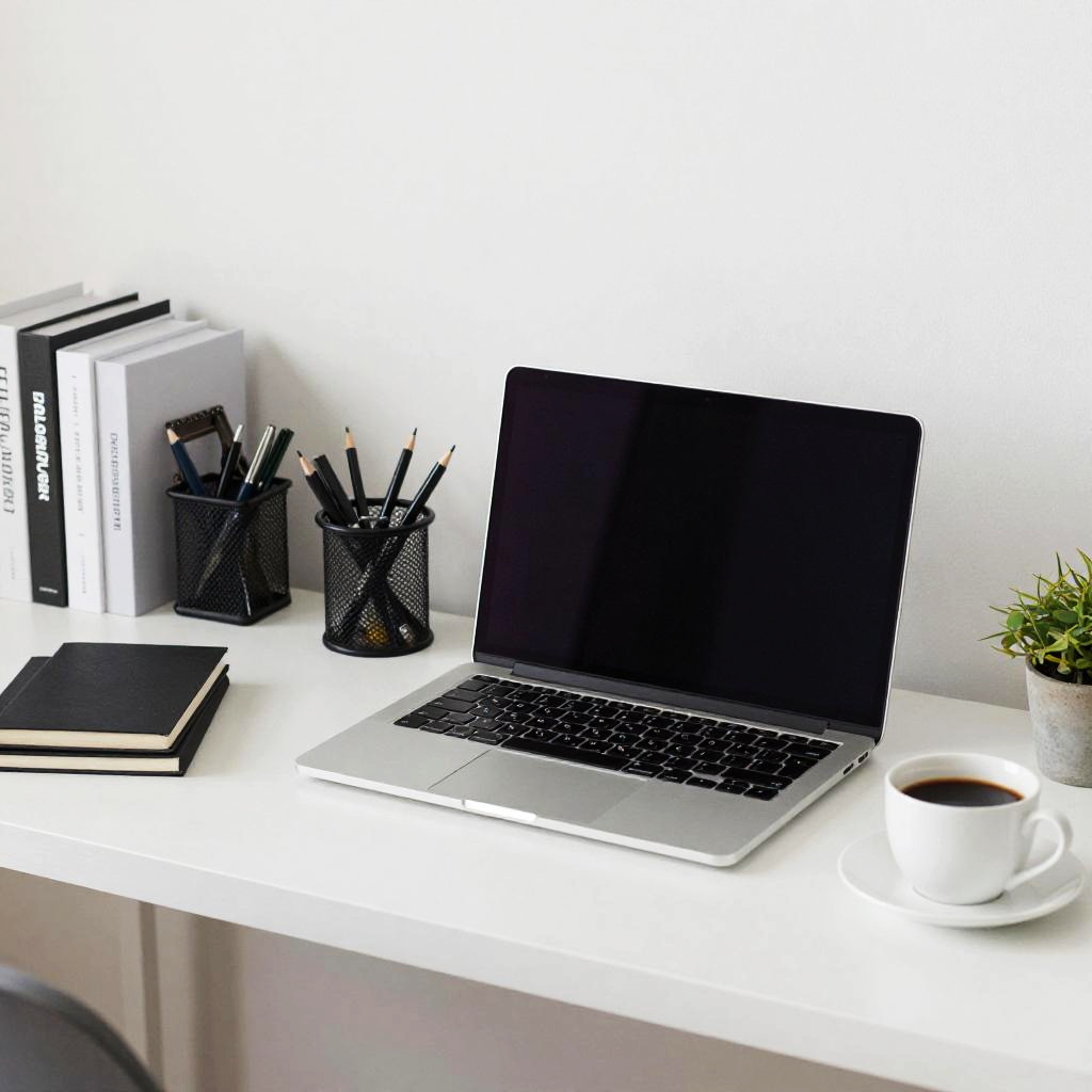 Clean.up pictures illustrating a clutter-free desk with minimalistic setup including a sleek laptop, tidy stationery, a cup of coffee, and soft ambient lighting, highlighting an environment optimized for focus and clean aesthetics.