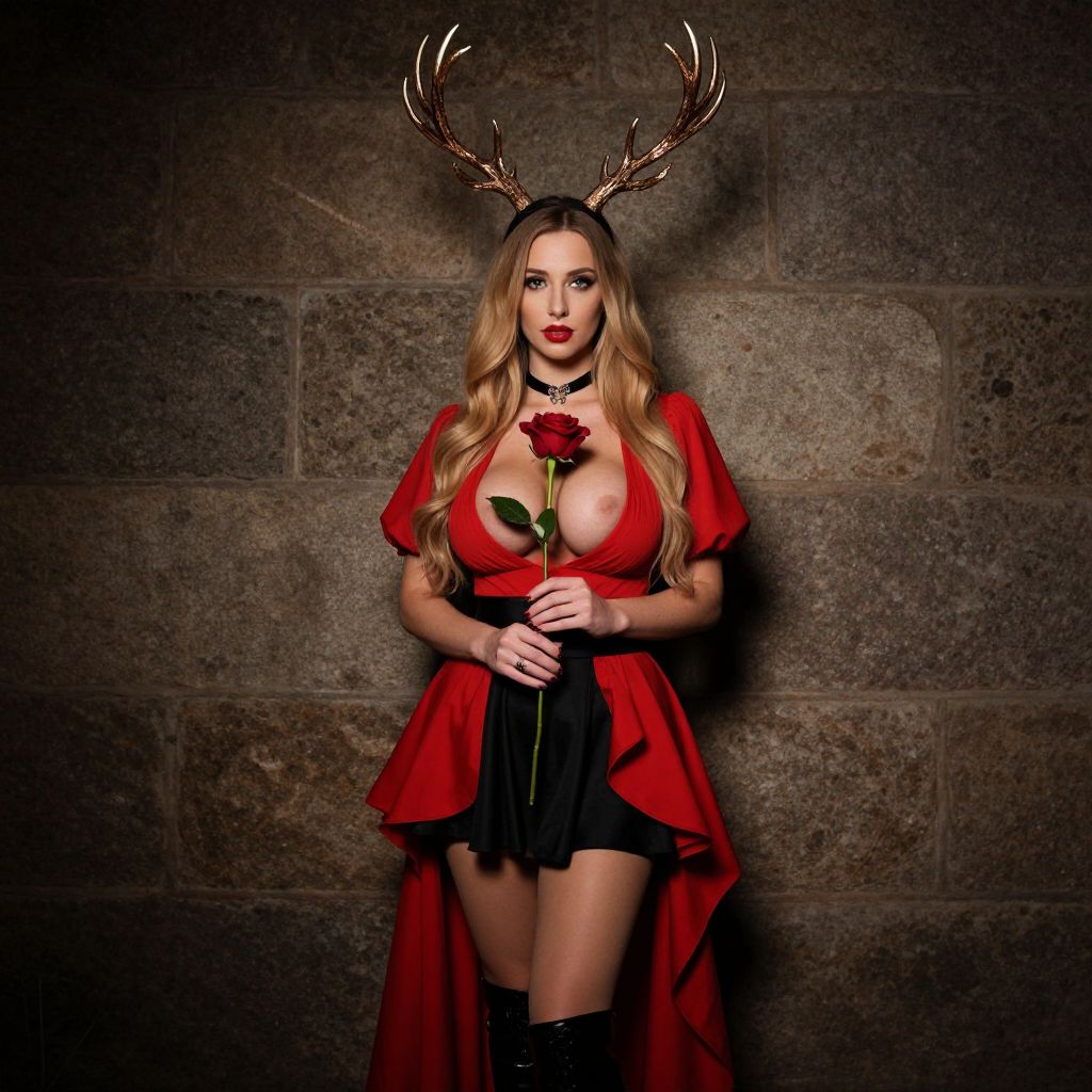 A woman with long blonde hair and antlers on her head is wearing a red dress with a black skirt and black boots. She is holding a red rose in her hands and standing in front of a stone wall. She has big tits and a sexy appearance, exuding an aura of mystery and elegance. The scene is illuminated by soft, dramatic lighting that enhances the mystical atmosphere, with the stone wall providing a stark contrast to her vibrant attire. The antlers are intricately designed, adding a touch of fantasy to her appearance, while the red rose symbolizes love and passion. The overall composition is both enchanting and otherworldly, capturing a moment of timeless beauty and allure.