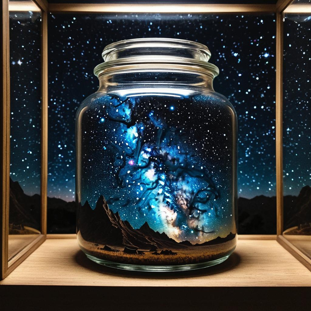 Fantasy painting by lena vargas of the Milky Way galaxy contained inside an ancient intricately engraved jar floating in a glass display case at dusk