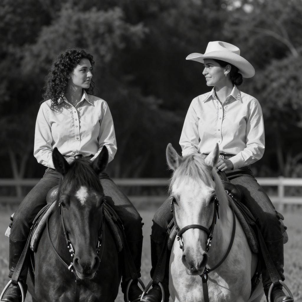 Black and white photograph of two women riding horses. Both wear light-colored, long-sleeved shirts with decorative collars and dark pants. Woman on left has curly hair, neutral expression. Woman on right wears a cowboy hat, smiling. Horses in foreground, trees in background. Both women sit upright, facing each other. Sunlight casts shadows.