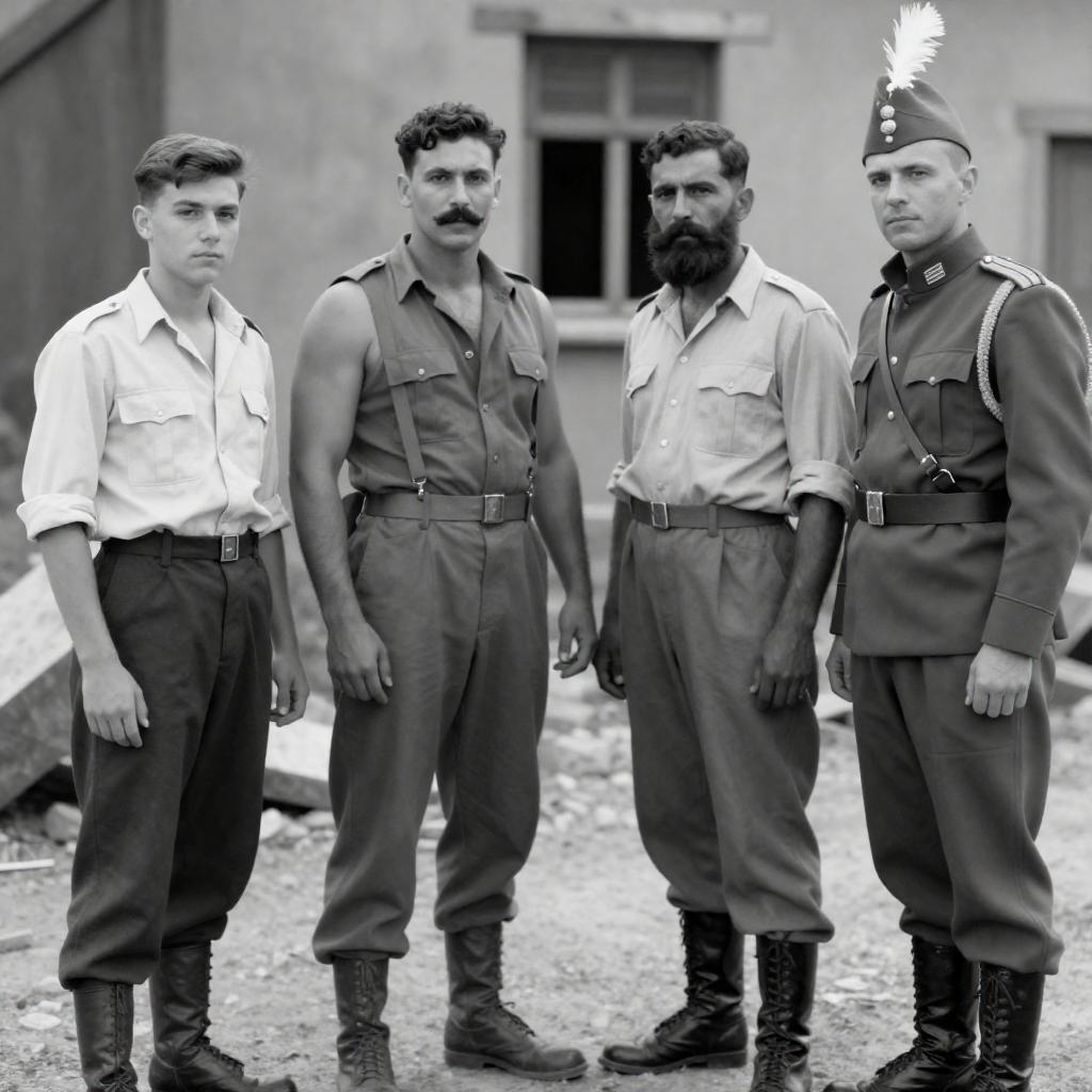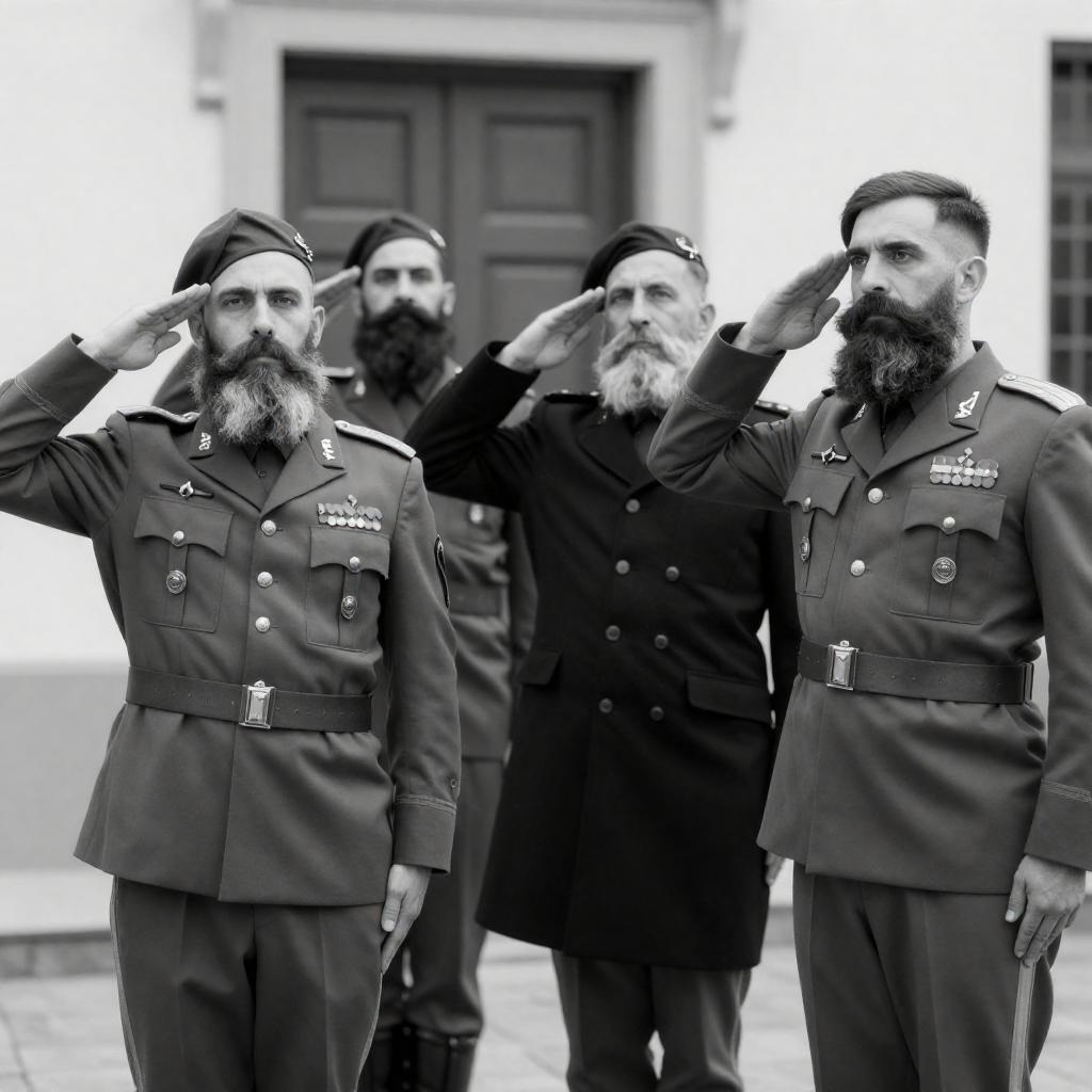 Black and white photograph of four military officers with long beards, saluting. Three officers in uniform with medals and epaulets, one in dark coat. Second officer from left has mustache. Door in background. Rightmost officer saluting with left hand. All looking to the right.