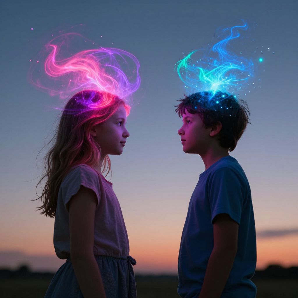 Two children stand face-to-face against a twilight sky, their heads radiating vibrant cosmic auroras—pink and purple swirls emanate from the girl's head, while blue and teal sparks burst from the boy's, symbolizing the invisible exchange of thoughts and emotions between them.