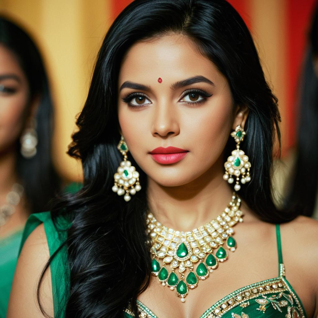 Portrait of an elegant Indian woman with long black hair and brown eyes, wearing a sleeveless red dress. She is adorned with traditional gold jewelry including a detailed necklace, earrings, and a small red bindi on her forehead. The background is blurred red, highlighting her poised expression and styled hair.