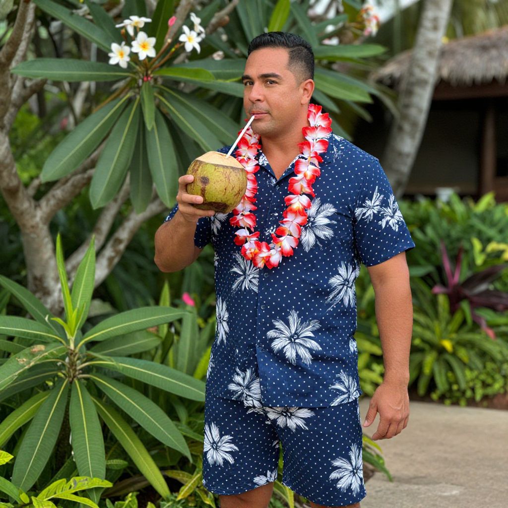Photograph of a muscular, tan-skinned man with short black hair, wearing a navy blue floral shirt and matching shorts, coconut drink, red and