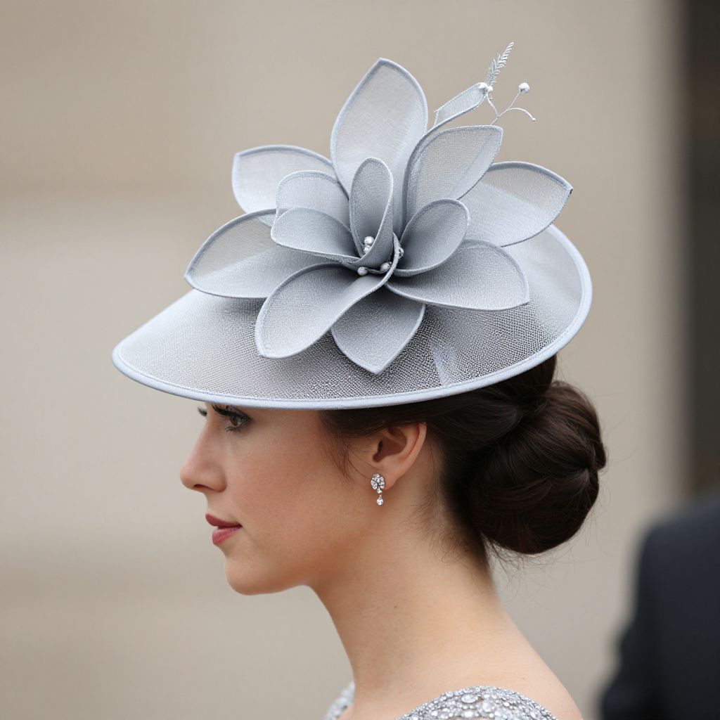 Elegant silver-grey wedding hat featuring a layered petal design perched atop a woman's neatly styled bun, complemented by a delicate diamond earring and formal attire.