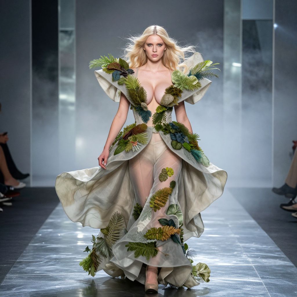 Blonde model in a flowing, sheer white gown adorned with green palm leaves, showcasing a deep neckline, walks a futuristic runway.