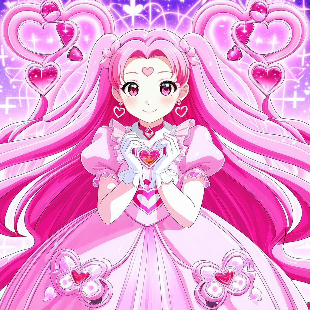 Cure grace, healin' good precure, 1girl, pink eyes, pink hair, long hair, very long hair, heart hair ornament, hair flower, white gloves, pink dress, pink choker, puffy short sleeves, earrings, magical girl, magical girl, by artist itatatata, anime