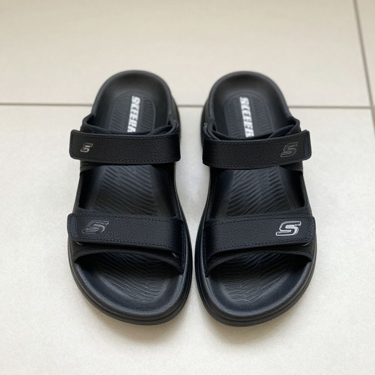 Black Skechers Sandals on Tiled Floor