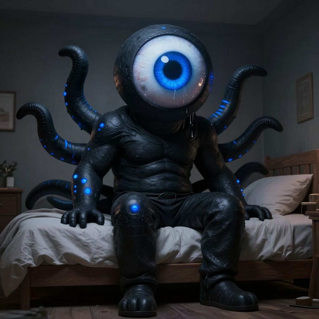 Photograph of a person in a detailed, black, sci-fi costume resembling a multi-eyed octopus-like creature with a large, glowing blue eye in the center of a textured, dome-shaped head. The creature has eight black, tentacle-like appendages with blue bioluminescent accents. It sits on a bed with white sheets in a dimly lit bedroom. The background includes a wooden headboard, a nightstand with a potted plant, and framed pictures on the wall. The creature's black, textured suit contrasts sharply with the white bed linens and dark room. The overall atmosphere is eerie and futuristic.