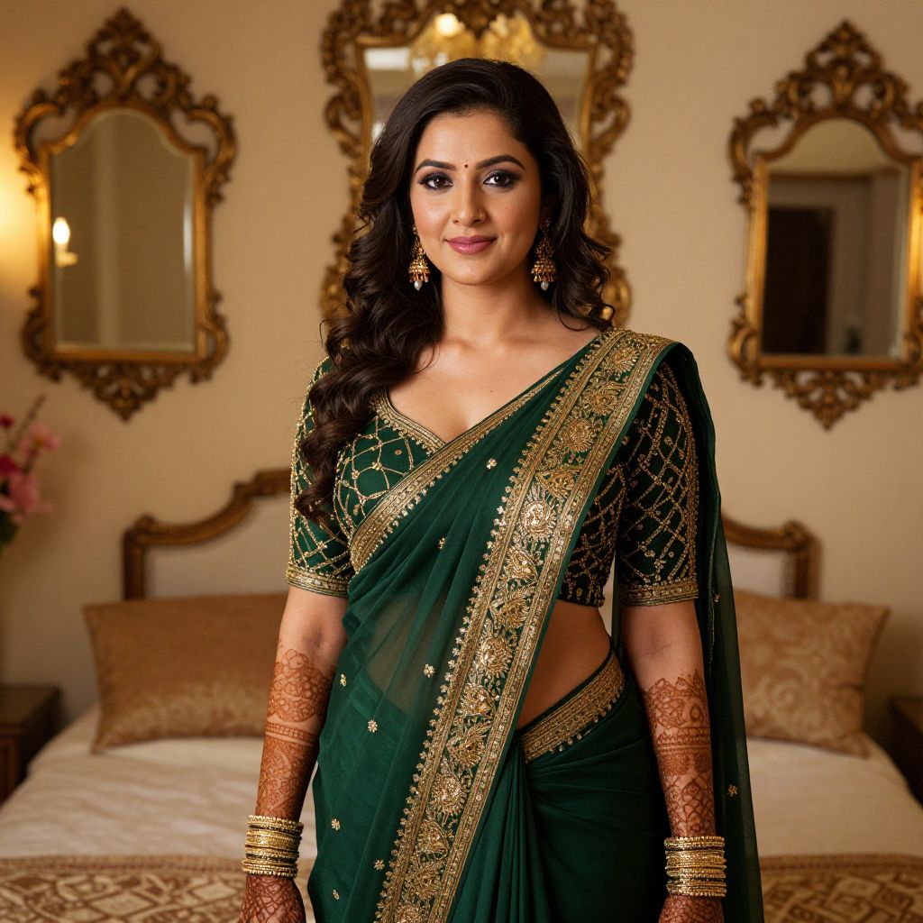 Photograph of an elegant Indian woman with long dark hair, wearing a green and gold embroidered sari, standing in a warmly lit bedroom with ornate