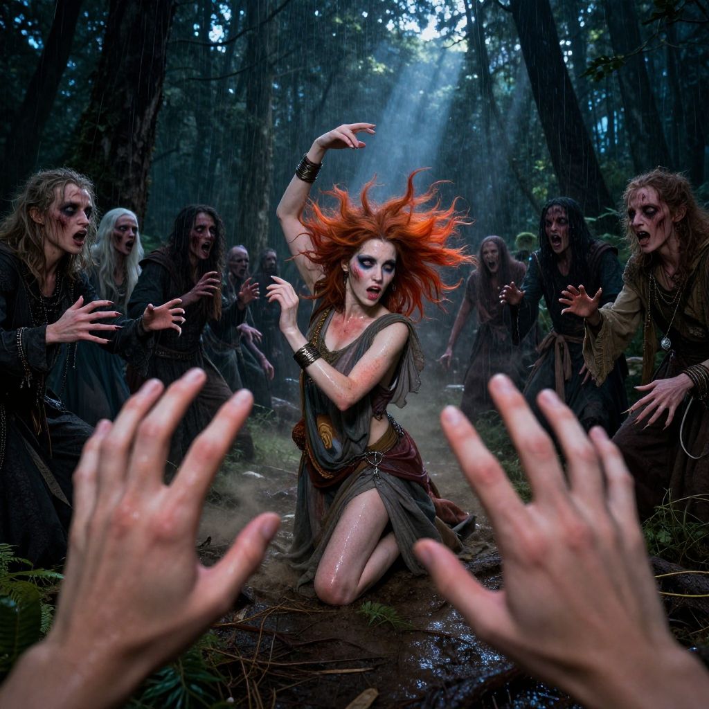 Photograph-like digital artwork depicting a forest scene at night with a central female figure with fiery red hair, pale skin, and dramatic makeup, kneeling and dancing with raised arms. She wears a dark, revealing dress with gold accents, and has a confident, intense expression. Surrounding her are eight men with pale, decayed skin and dark, wild hair, wearing tattered clothing, their expressions eerie and menacing. The background features tall, shadowy trees with misty, ethereal light filtering through. In the foreground, outstretched hands are visible, suggesting observers or participants. The overall mood is dark, mystical, and otherworldly.