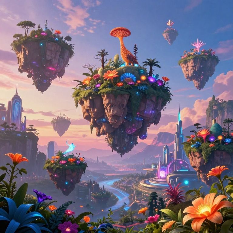 Floating stone basin with cascading waterfall, surrounded by floating islands with lush greenery and purple flowers, set against a cloudy sky. Digital fantasy artwork.