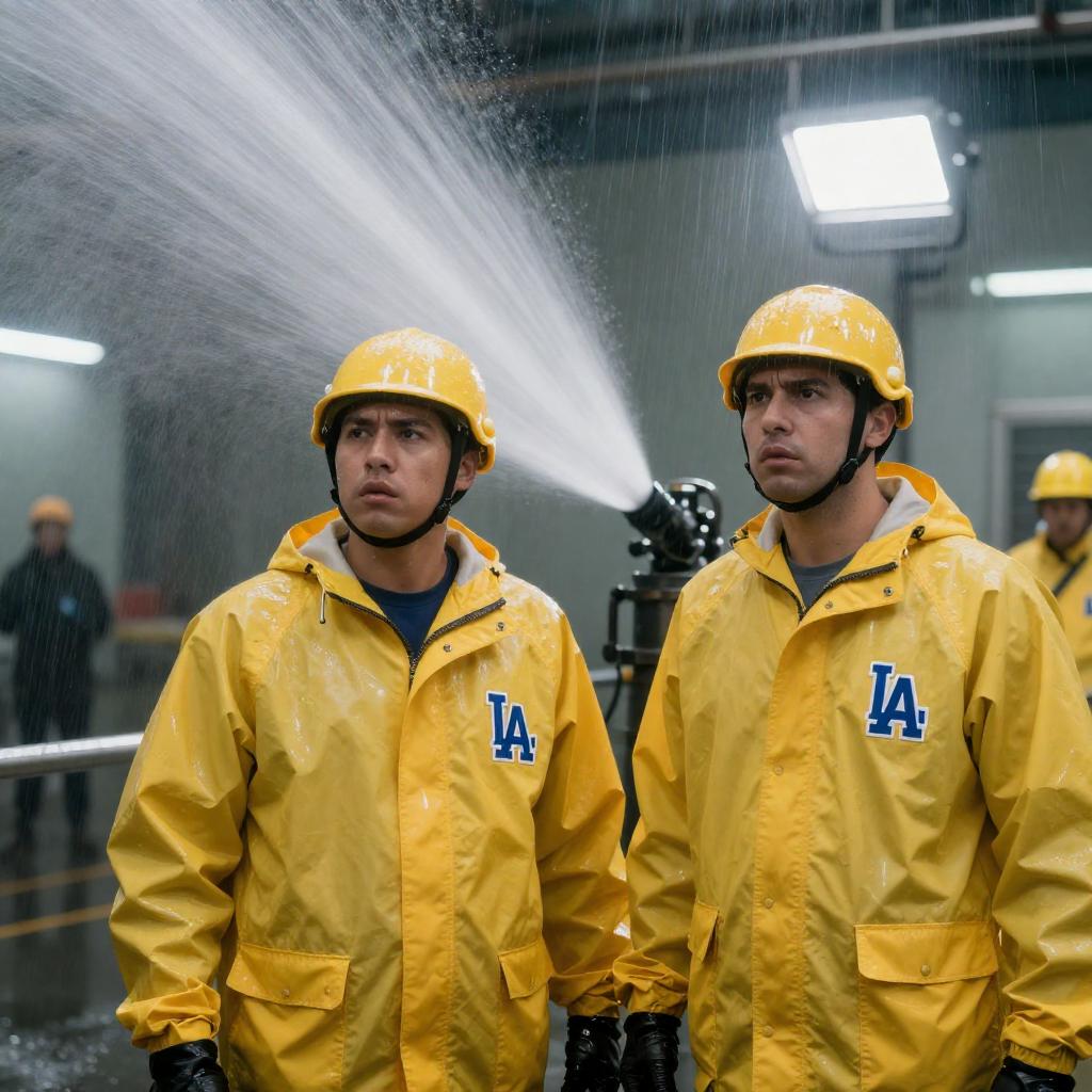 Two men wearing yellow LA-branded raincoats and yellow safety helmets stand in an industrial setting. They are focused and serious as water sprays forcefully from a machine behind them. The environment is wet with reflections visible, indicating active water flow, under bright artificial lighting.