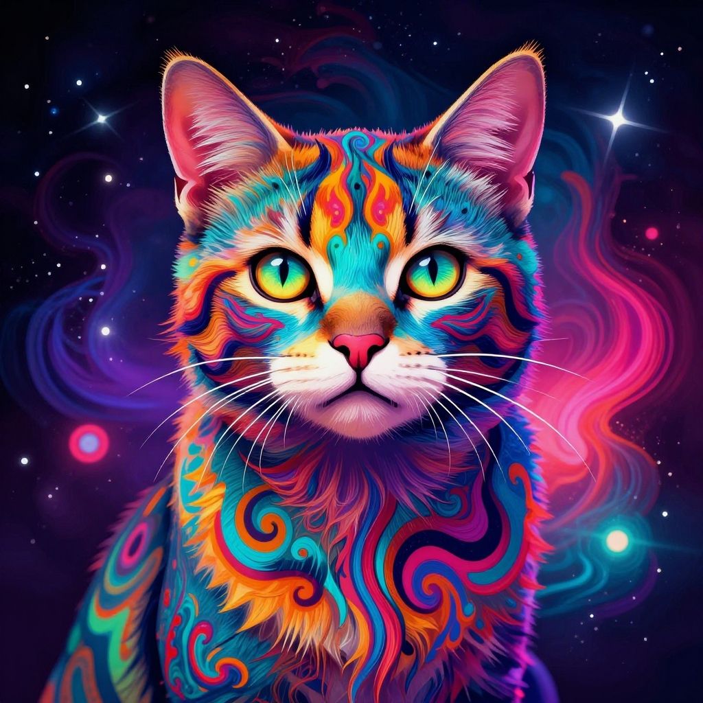 Vivid psychedelic cat art portraying a whimsical cat with flowing fur that blends into psychedelic waves and patterns, set against a starry night with glowing psychedelic mushrooms.