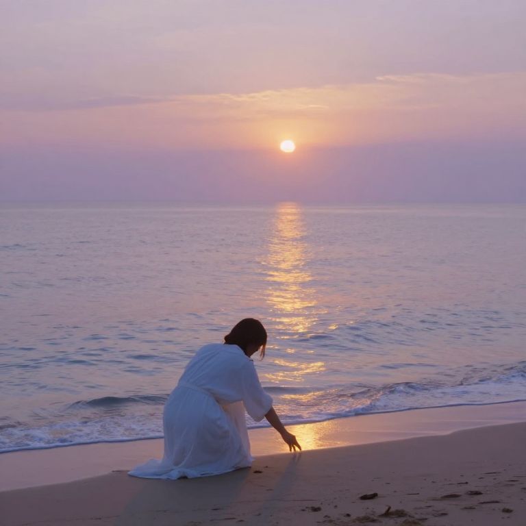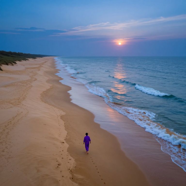 Envision a tranquil beach panorama at dusk, reminiscent of the enchanting illustrations by Gustave Doré. From an elevated viewpoint, witness a solitary traveler strolling towards the horizon, their outline blending with the soft shades of the setting sun. As they near the water's edge, they are embraced by a mystical glow that lights their path, casting glistening reflections on the waves. This ethereal illumination transitions from warm amber to cool blues and purples, mirroring the emotional voyage of both the wanderer and the observer - evoking a sense of yearning, serenity, and the profound beauty discovered during nature's twilight hours.