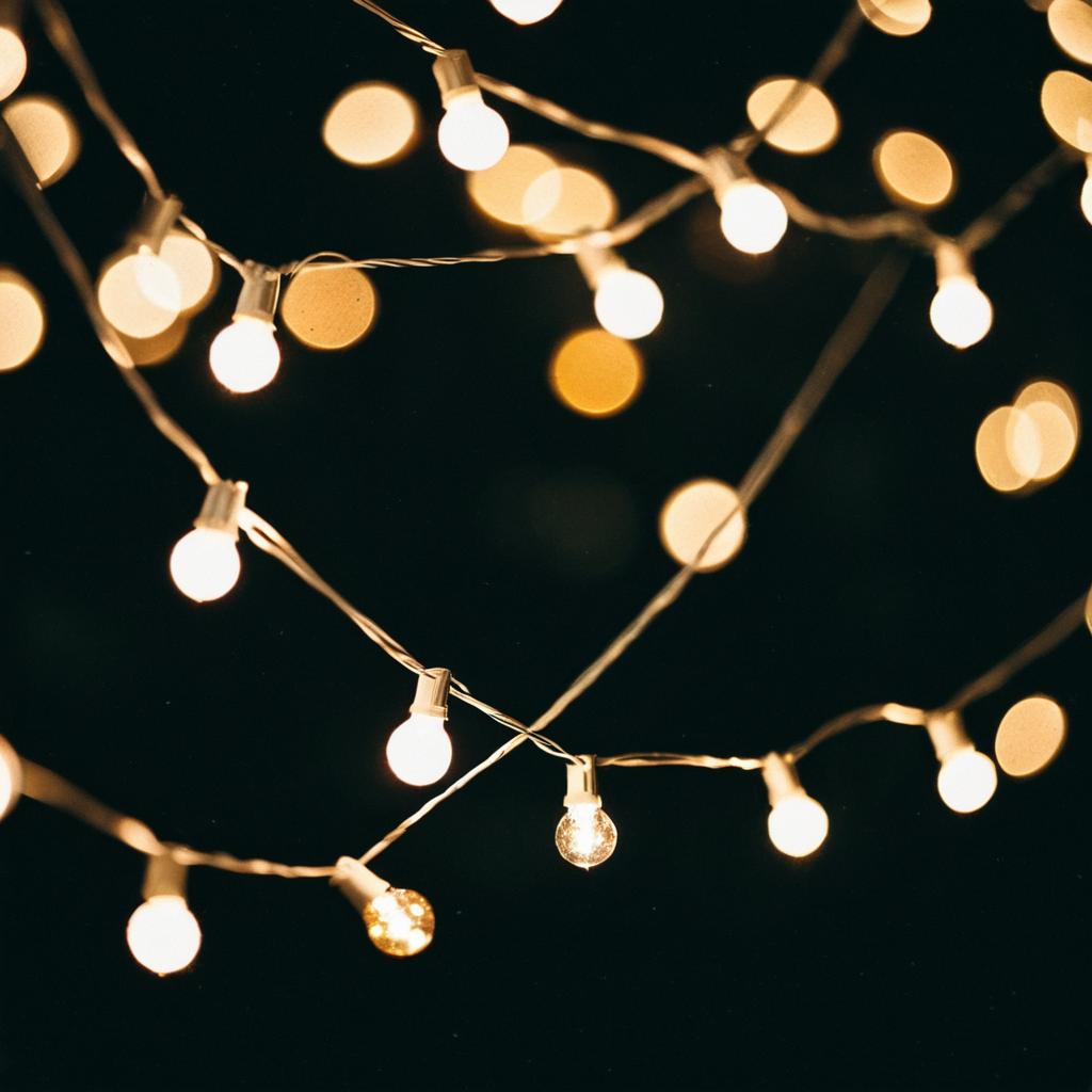 Close-up of twinkling string lights with warm white lights, portrait mode, soft holiday ambiance.