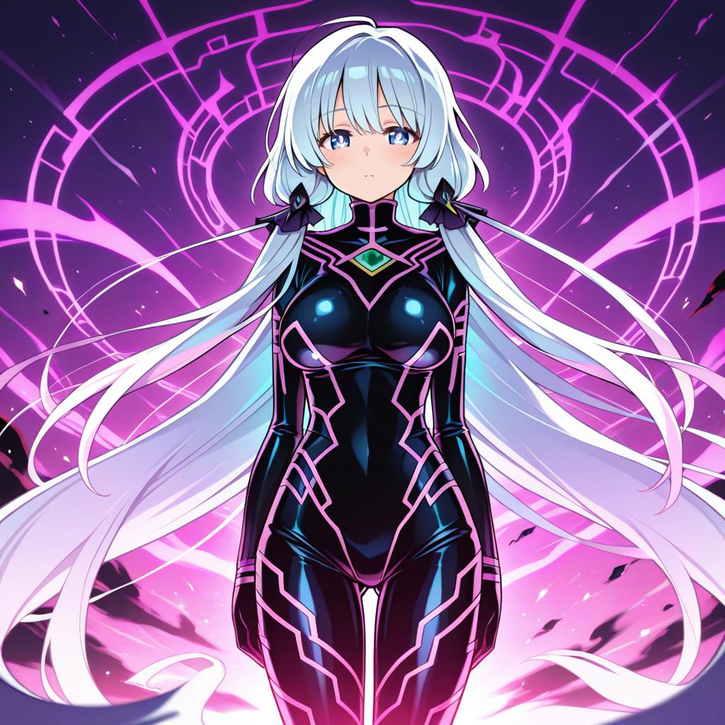 Digital artwork of a futuristic anime girl with very long white hair and cross-shaped blue pupils. She wears a shiny black bodysuit with pink geometric patterns and a green gem on the chest. The background features a glowing purple and pink sci-fi design, evoking a high-tech or otherworldly atmosphere. The style is inspired by anime and manga aesthetics.