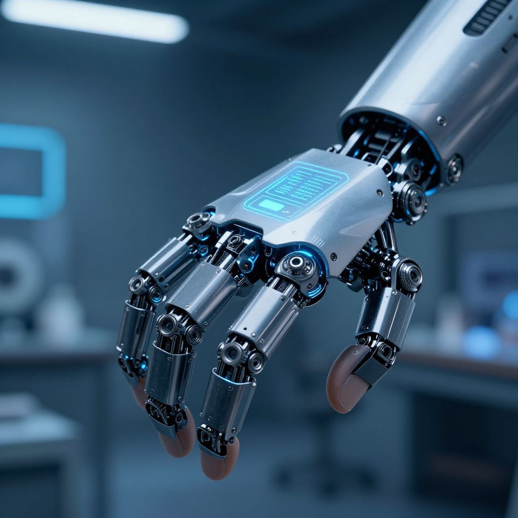 Photograph of a futuristic robotic hand with metallic fingers, blue LED display, and glowing accents, hovering in a dimly lit laboratory.