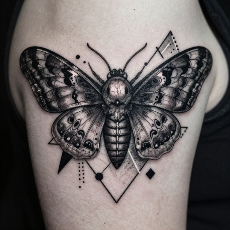 Surreal death skull moth tattoo concept, incorporating a cracked skull morphing into ornate moth wings, enhanced by geometric shapes and dotwork, rendered in deep blacks and soft grays for depth.