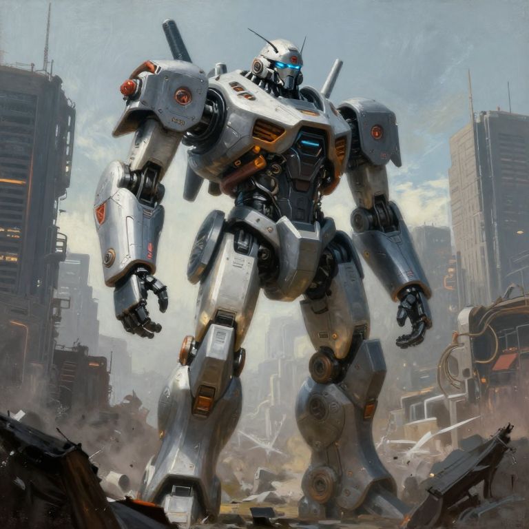 Digital artwork of a towering, white and grey mecha robot with blue accents, standing amidst a destroyed, futuristic cityscape with skyscrapers. Dust