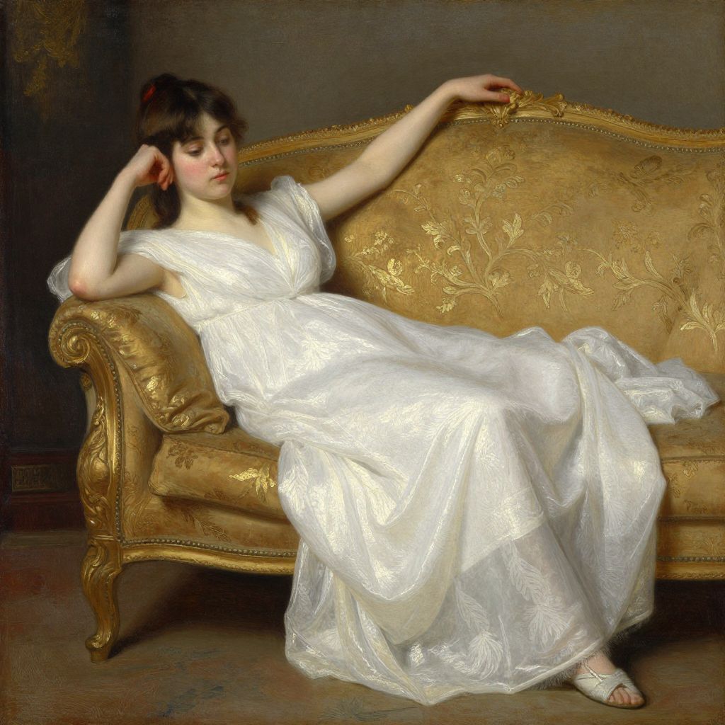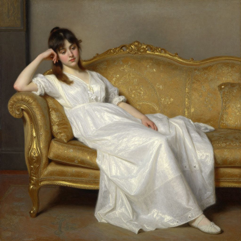 A classical oil painting by Alfred Emile Stevens depicts a serene young woman in a flowing white dress, elegantly resting on a plush gold-embellished sofa, showcasing the artist's masterful use of light and texture to capture a moment of quiet contemplation.