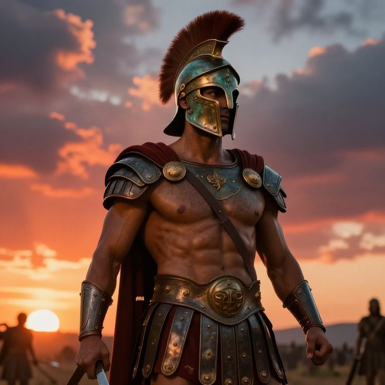 Photograph of muscular, shirtless ancient Greek warrior with bronze helmet and plumed crest, in detailed armor, standing against a vibrant sunset sky.