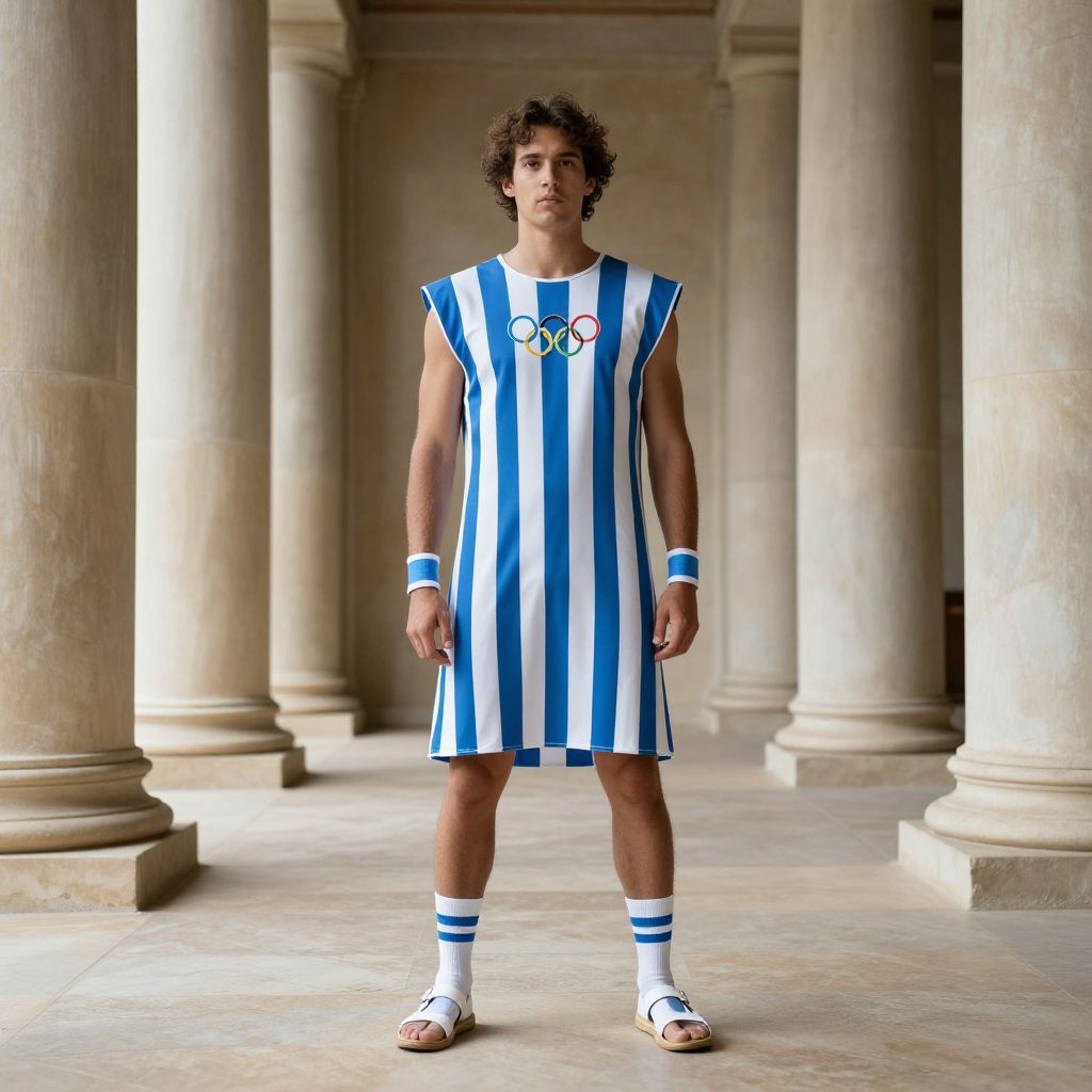Photograph of a curly-haired man in a blue and white striped ancient Greek-style tunic, Olympic rings, white sandals, and blue wristbands,