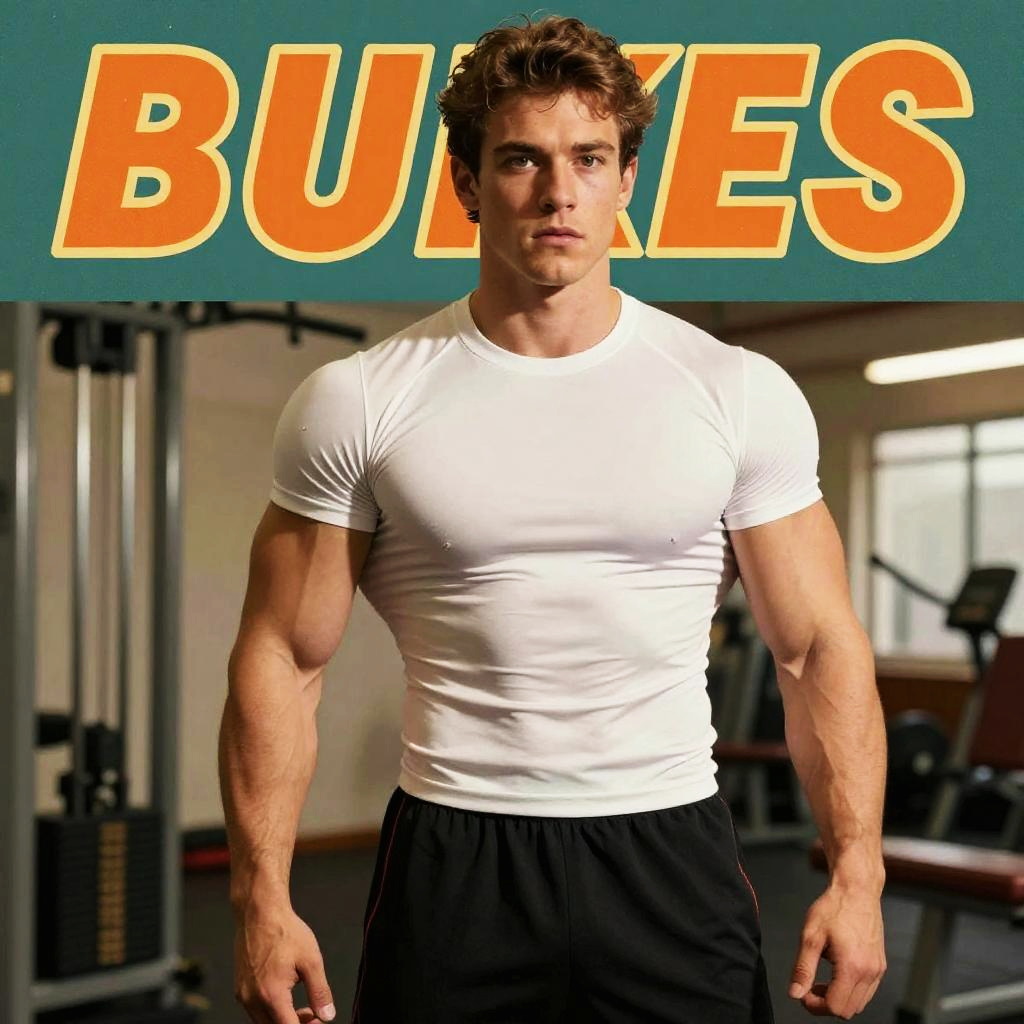 Muscular man in tight shirt, vintage 1980s workout poster style, bold colors, retro typography, confident stance, gym equipment in background