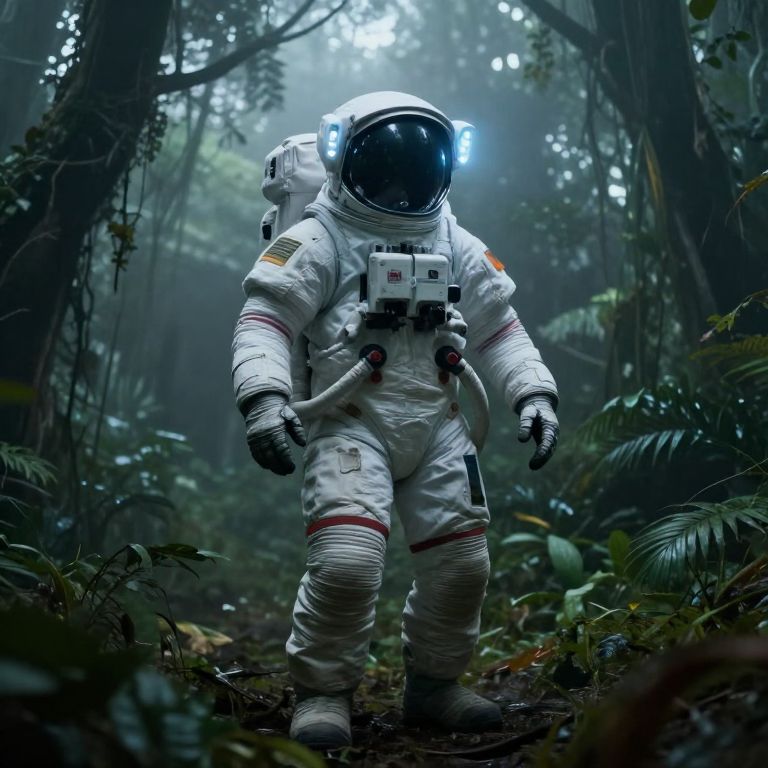 Photograph-style CGI of an astronaut in a white spacesuit with a glowing helmet, standing in a dense, misty jungle.