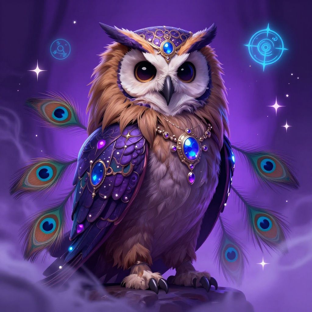 Digital art of a majestic owl with large, expressive eyes and detailed, iridescent feathers adorned with blue and purple gemstones. The owl's chest and wings feature intricate, jeweled patterns, and its tail feathers display vibrant peacock eyespots. It stands on a misty purple surface, surrounded by glowing, mystical blue circles and sparkling stars in the background. The owl's head is crowned with a blue gemstone, adding to its regal appearance. The overall style is fantasy, with a rich, magical color palette and a focus on detailed textures and vibrant, otherworldly elements.