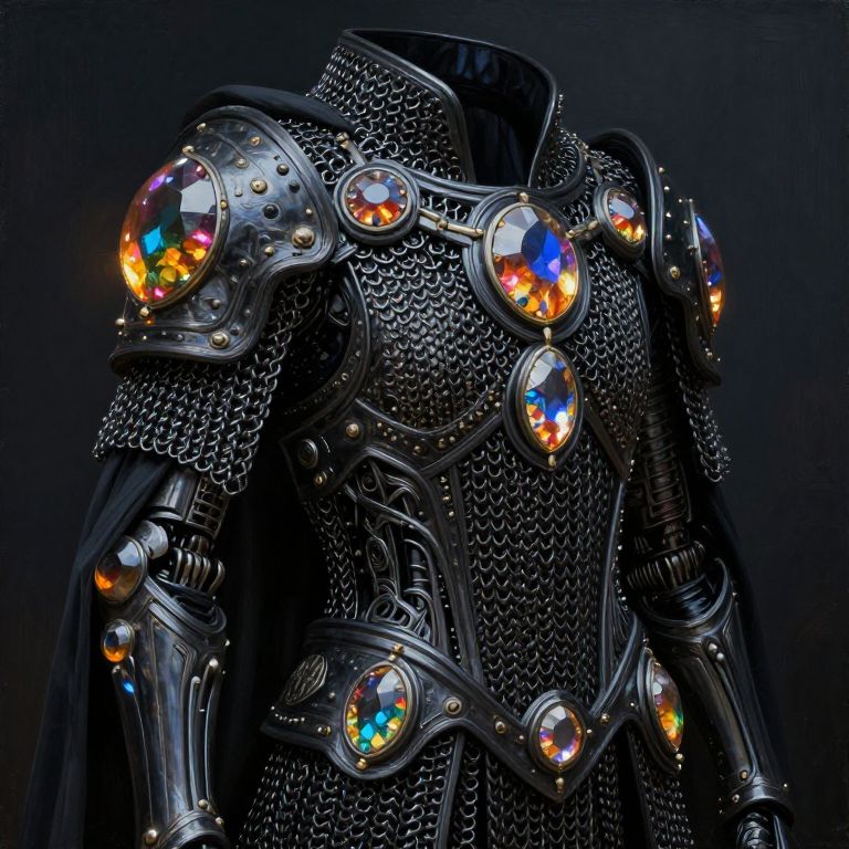 Photograph of a futuristic, metallic armor with intricate chainmail and glowing, multicolored gemstones on the shoulders and chest. Dark, sleek background