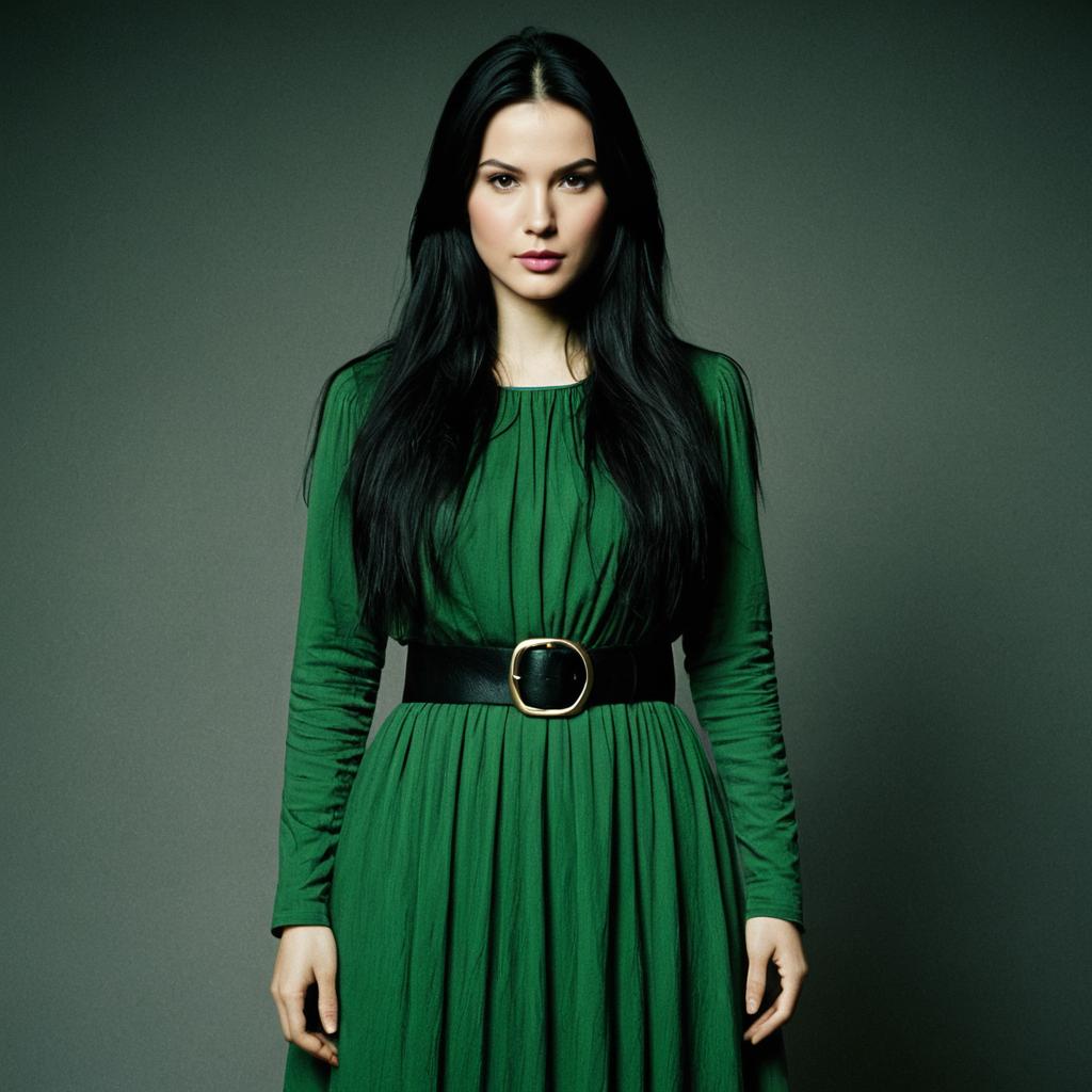Portrait of a young woman with long black hair wearing a green long-sleeve dress cinched at the waist with a black belt featuring a large gold buckle. She stands confidently against a plain gray background, looking directly at the viewer with a neutral expression and closed mouth.