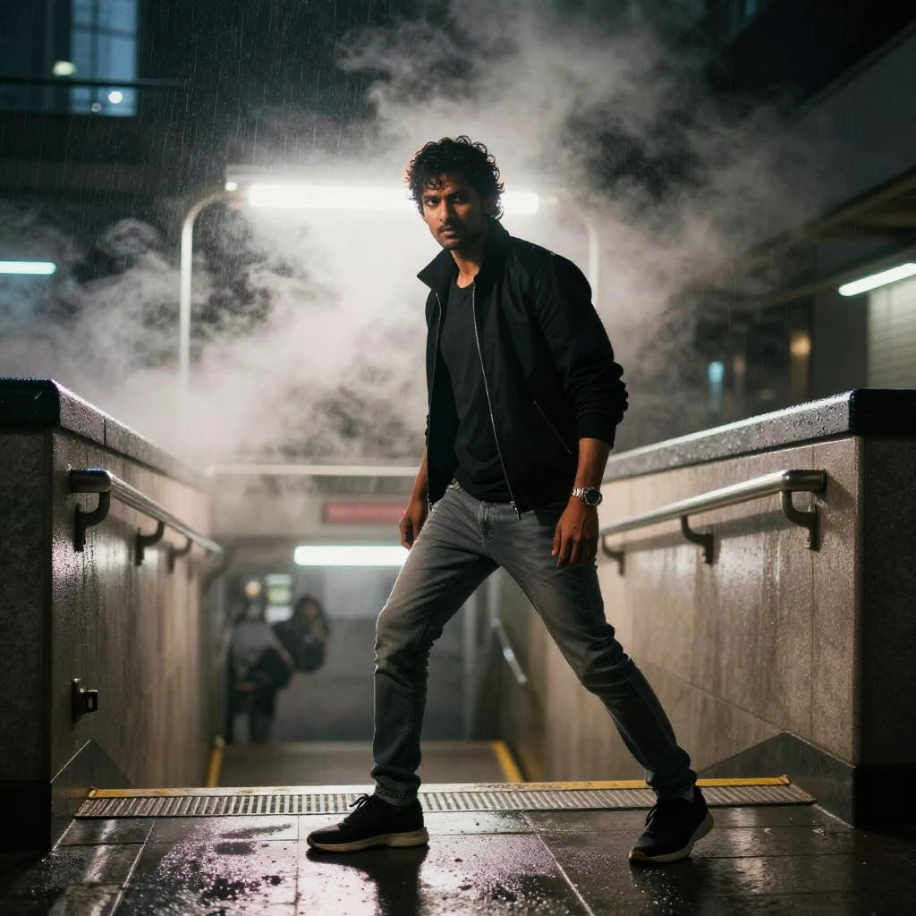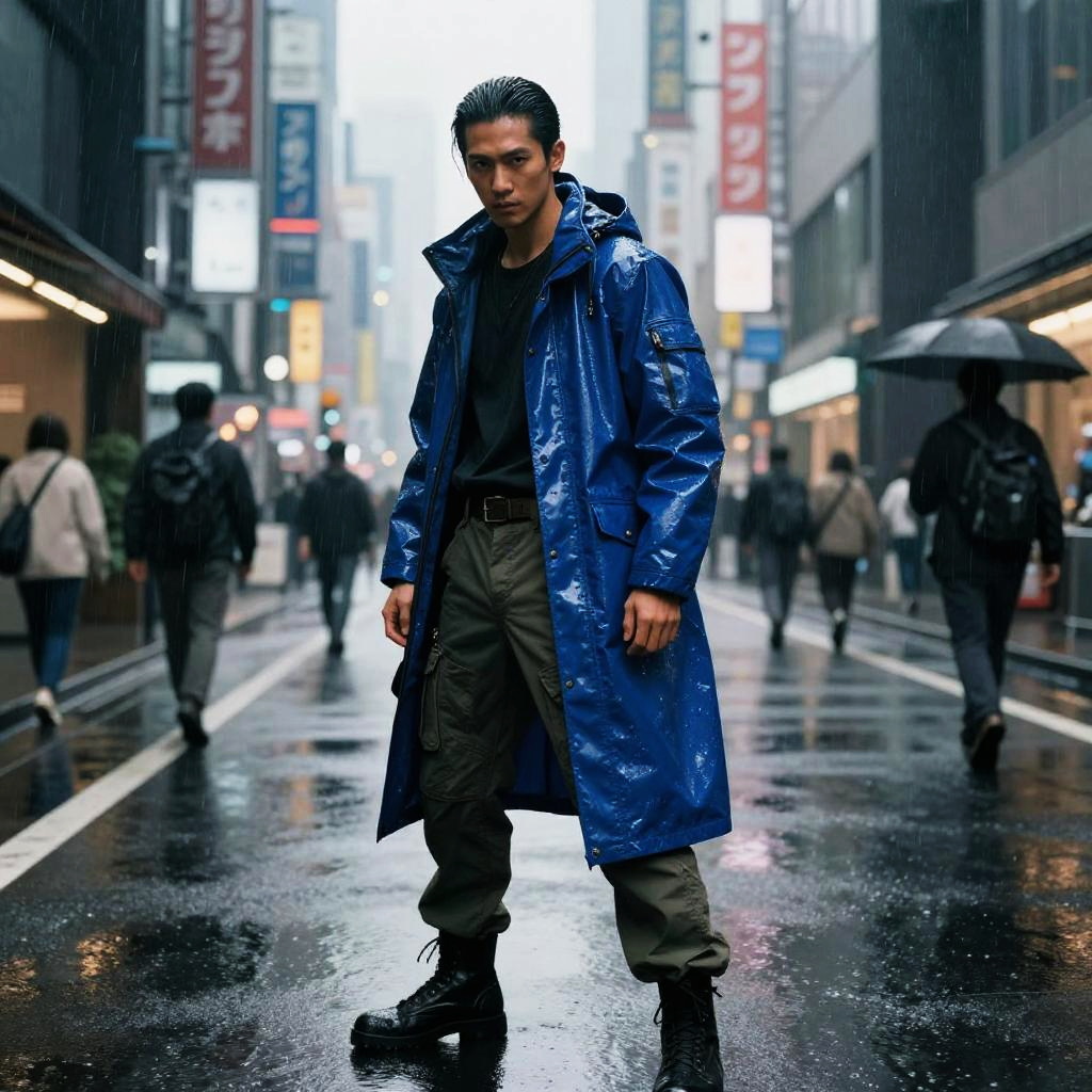 Cinematic action photograph in rain-drenched busy street in cyberpunk Tokyo, featuring slim Southeast Asian man with slicked-back hair wearing glossy blue raincoat over tactical cargo pants. High-contrast lighting with hard rim light and deep shadows; backlit mist or rain for atmosphere; wet reflections, modern architecture, and long leading lines. Dynamic stance facing camera, intense gaze. Ultra-detailed textures, shallow depth, subtle film grain, dramatic color grade, edgy, high-energy.