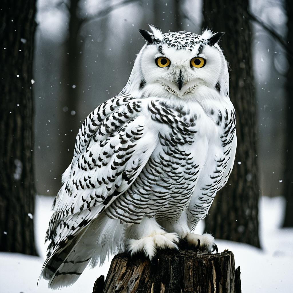 Snowy Owl on Tree Stump in Winter Forest