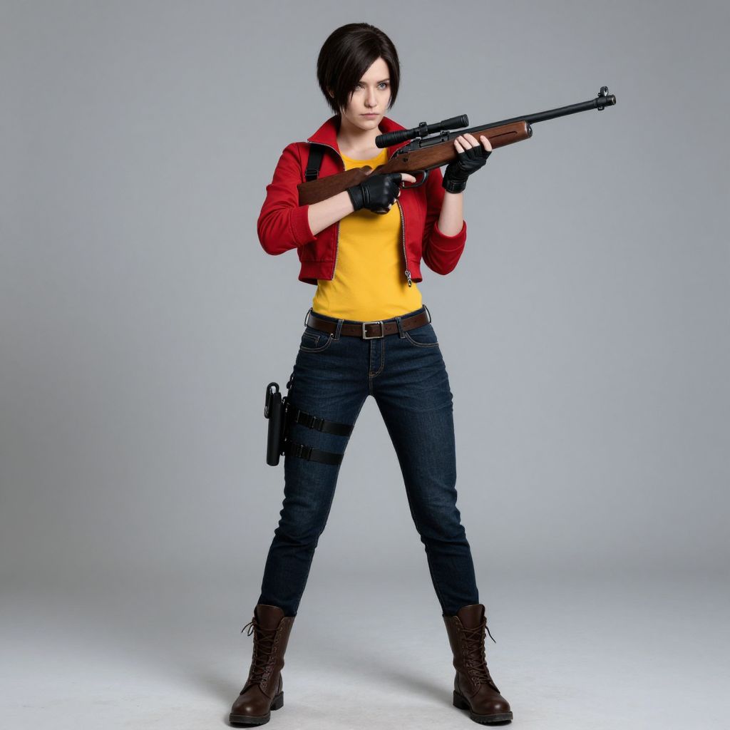 A high-definition digital illustration of a character in a Resident Evil cosplay, featuring a striking cyberpunk aesthetic with detailed 3D rendering, showcasing a bold red jacket, tactical gear, and a futuristic sniper rifle, created by RESINGMT-COIL.