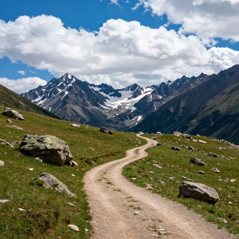 Photograph of a winding dirt path through a grassy meadow, leading to snow-capped mountain peaks under a bright, cloudy sky.