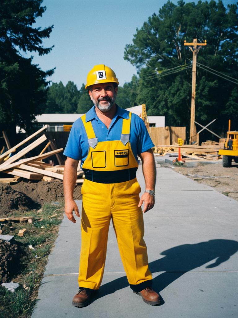 Man in Bob Builder Costume, photorealistic outdoor portrait, daylight