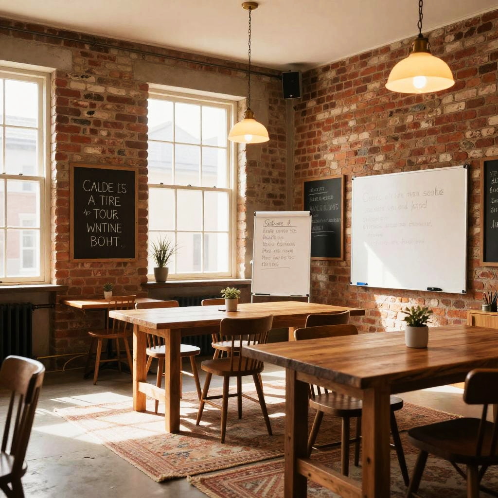 Schulungsraum rustic style with exposed brick walls, wooden tables and chairs, vintage lamps hanging from ceiling, cozy and inviting setting for seminars, flip charts, soft carpets, motivational quotes on chalkboards, natural earth tones, warm sunlight streaming through tall windows