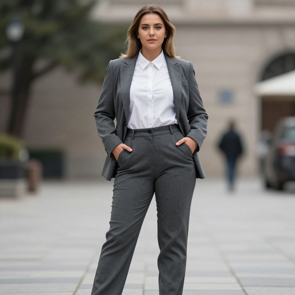 Flattering plus size pant, solo, 1girl, hand in pocket, suit, shirt, jacket, pants, white shirt, outdoors, formal, blurry background, grey jacket, realistic, blurry, brown hair, looking at viewer, collared shirt, blonde hair, grey pants, standing
