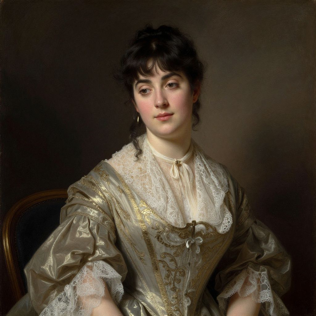 A classical oil painting portrait by John William Waterhouse, featuring a woman in a Victorian-era gown with intricate lace detailing, rendered with dramatic lighting and high-definition realism.