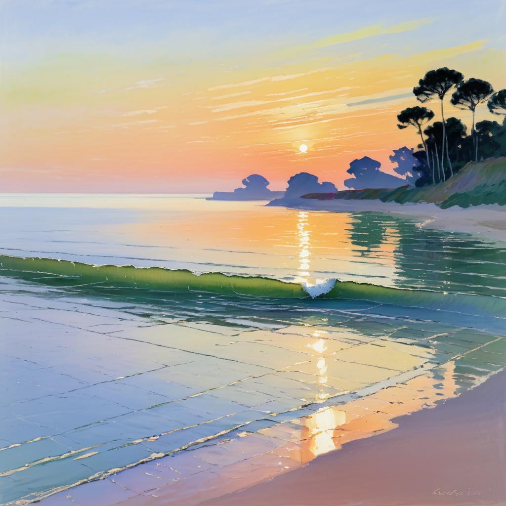 Detailed illustration of a tranquil beach at sunset featuring soft waves, palm trees, and a serene reflective water surface. The image captures a calm coastal landscape with a vibrant sky transitioning from light blue to warm orange hues, highlighting the sun near the horizon.