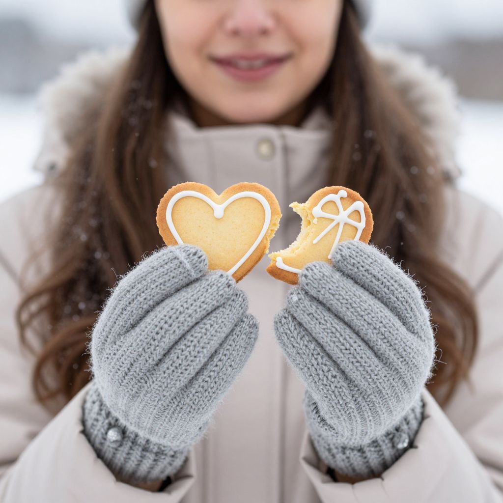 Photograph of a woman with long brown hair and light skin, partially visible from the nose down, smiling with pink lips. She wears a white winter coat with a fur collar and gray, textured knit mittens. She holds two gingerbread cookies: one with a heart shape and the other with a bird design, both decorated with white icing. Snowflakes are visible on her coat. The background is blurred, suggesting a snowy outdoor setting. The focus is on the gingerbread cookies she is holding close to the camera.