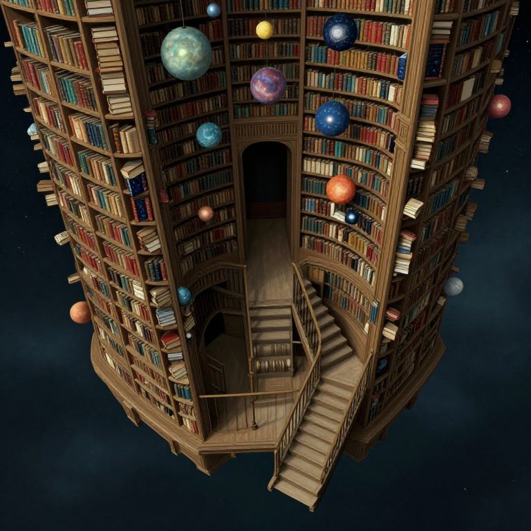 Digital art of a towering, circular bookshelf floating in space, filled with colorful books, featuring planets and a wooden staircase.