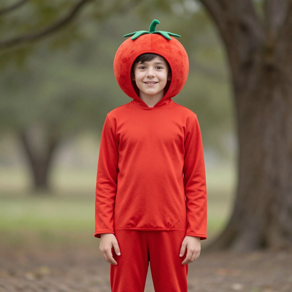 Tomato fancy dress costume, 1boy, male focus, solo, outdoors, hood, smile, tree, looking at viewer, blurry, pants, blurry background, hood up, day, realistic, standing, long sleeves