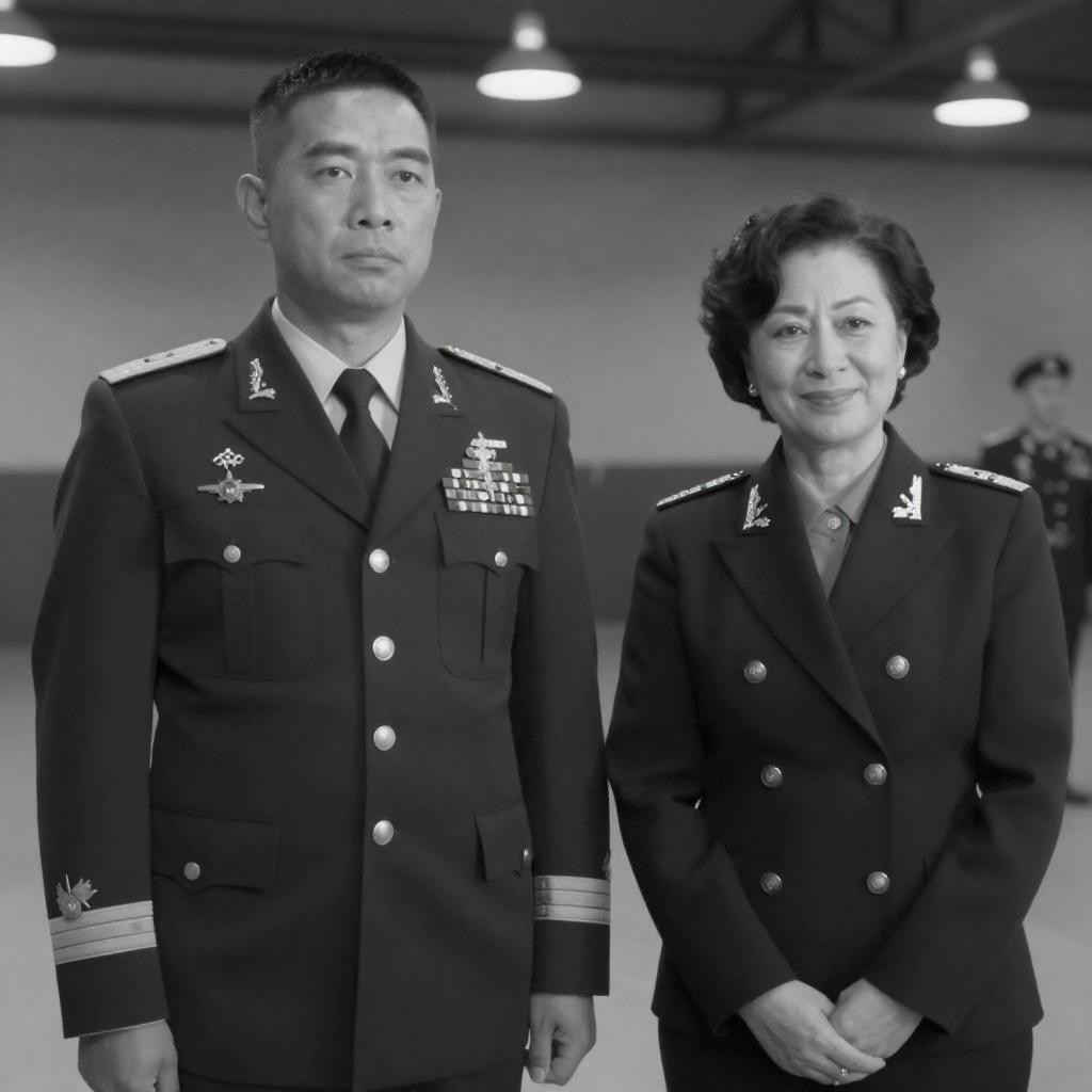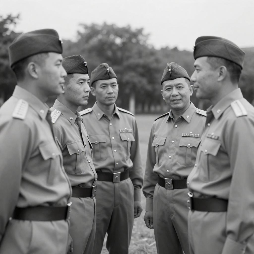 Black and white photograph of three men on an airport tarmac. Left: military officer in dark uniform and cap, right: civilian in light shirt and hat, center: man in light shirt. Military plane in background. Officer and central man talking, civilian looking to the right. Plane tail number visible.