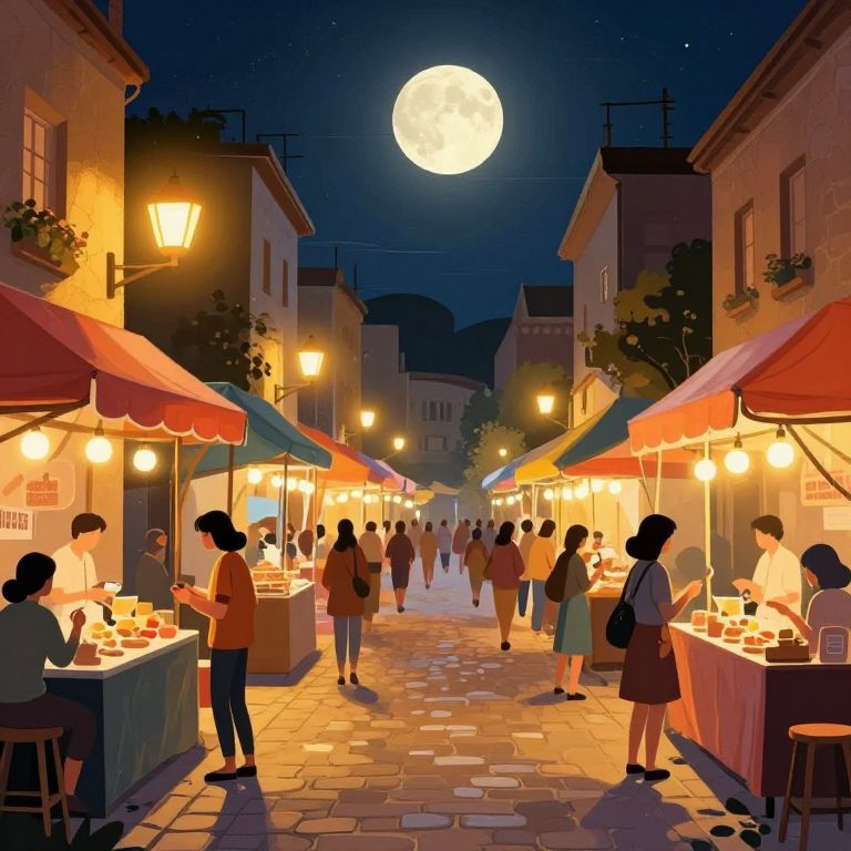 A vibrant digital illustration depicts a bustling night market under a luminous full moon, where warm streetlights cast a golden glow on cobblestone streets lined with colorful awnings, inviting patrons to engage in dreamy exchanges amidst the timeless charm of a retro urban setting.