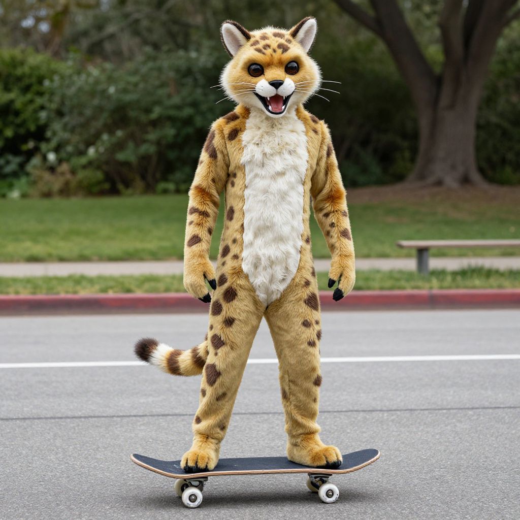 Photograph of a furry character resembling a cheetah standing on a skateboard in a park. The cheetah has a yellow and black-spotted fur coat, a white chest, and a black-tipped tail. Its mouth is open, showing a pink tongue, and it has large, expressive eyes. The background includes a grassy area, trees, and a paved road with a red curb. The skateboard has a black deck and white wheels. The cheetah's posture is upright, and it looks directly at the camera, exuding a playful and energetic vibe.