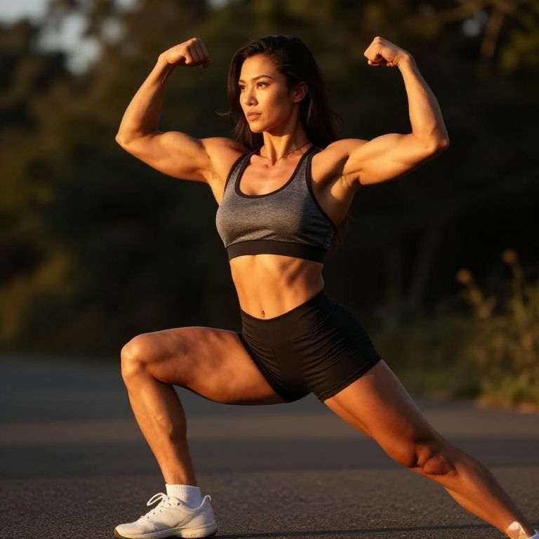 Photograph of a muscular woman with tan skin and long black hair, performing a dynamic lunge while flexing both biceps. She wears a gray sports bra and black athletic shorts, paired with white sneakers. Her well-defined abs, arms, and legs are highlighted by the warm, golden sunlight. The background is blurred with dark green foliage, suggesting an outdoor setting. The woman's intense expression and strong physique convey determination and fitness. The image has a high contrast, emphasizing her muscular definition and the textures of her clothing and skin.
